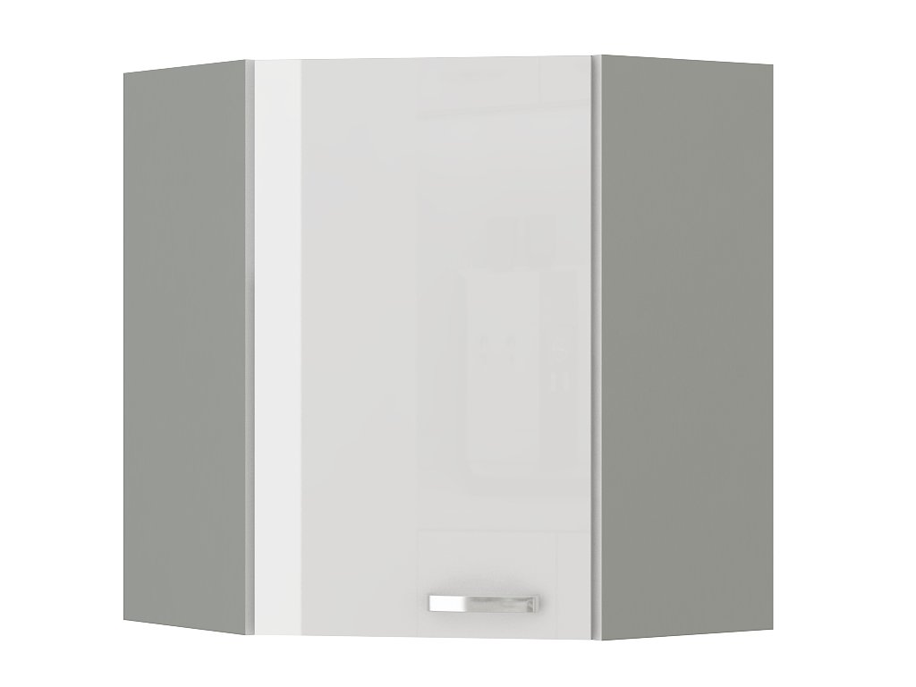 Horní rohová skříňka BLANKA 14 (58/58 cm) o rozměrech: šířka 58,5/58,5 x výška 71,5 x hloubka 31 cm. Je vyrobena z materiálu MDF s laminátovým povrchem. Barva skříňky je bílý lesk a korpusu je šedý. Úchyty jsou v kovové barvě. Skříňky jsou vybaveny systémem tichého dovírání dvířek.