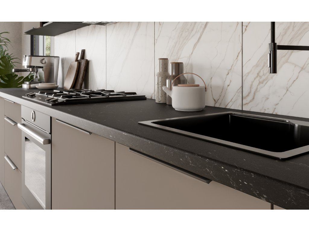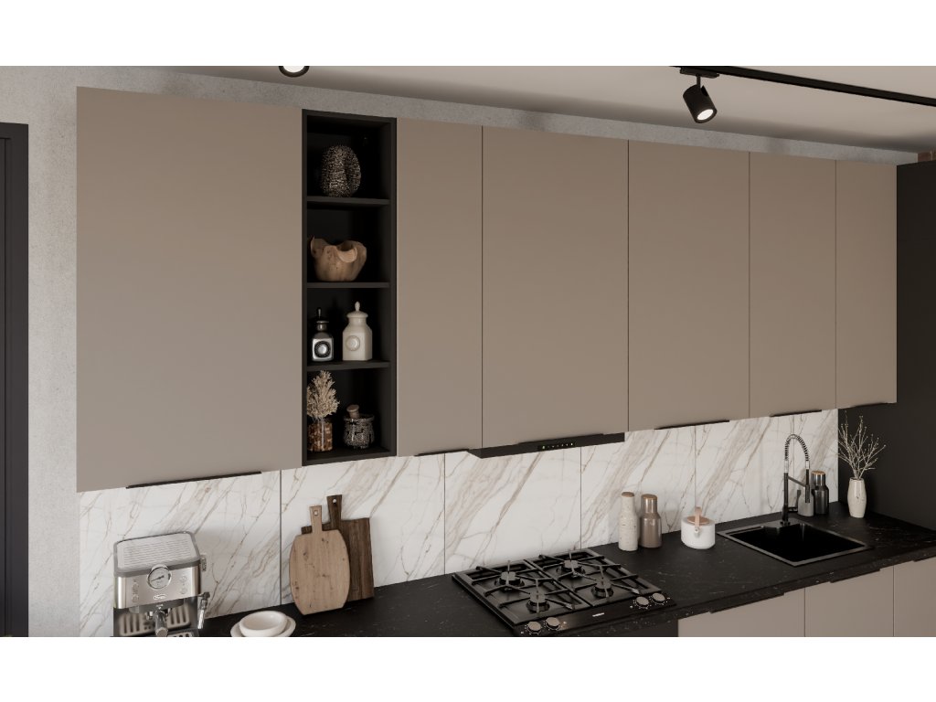 kuchyňskou linku můžete zakoupit buď jako sestavu, nebo po jednotlivých komponentech. Kuchyňská linka je dodávána v demontu. Korpus linky je v barvě černé. Dvířka jsou v barvě Sandgrau AFM. Kuchyňská linka je bez pracovní desky a spotřebičů.
